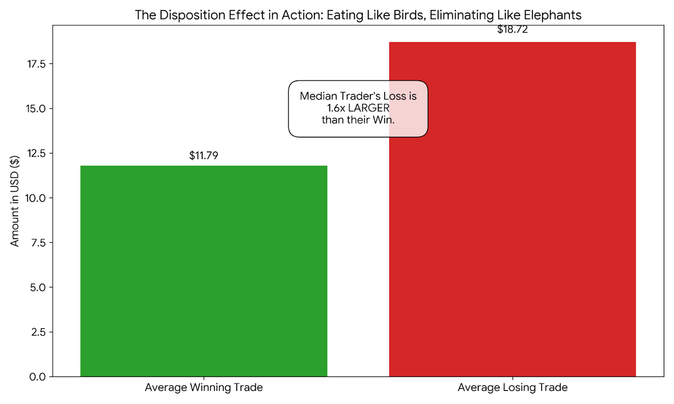 The psychological theory you quoted states that humans naturally hold onto losing trades entirely too long because their brains refuse to accept defeat, while simultaneously selling winning trades entirely too early out of fear. In the financial world, this is grimly known as “eating like birds, but producing waste like elephants.”